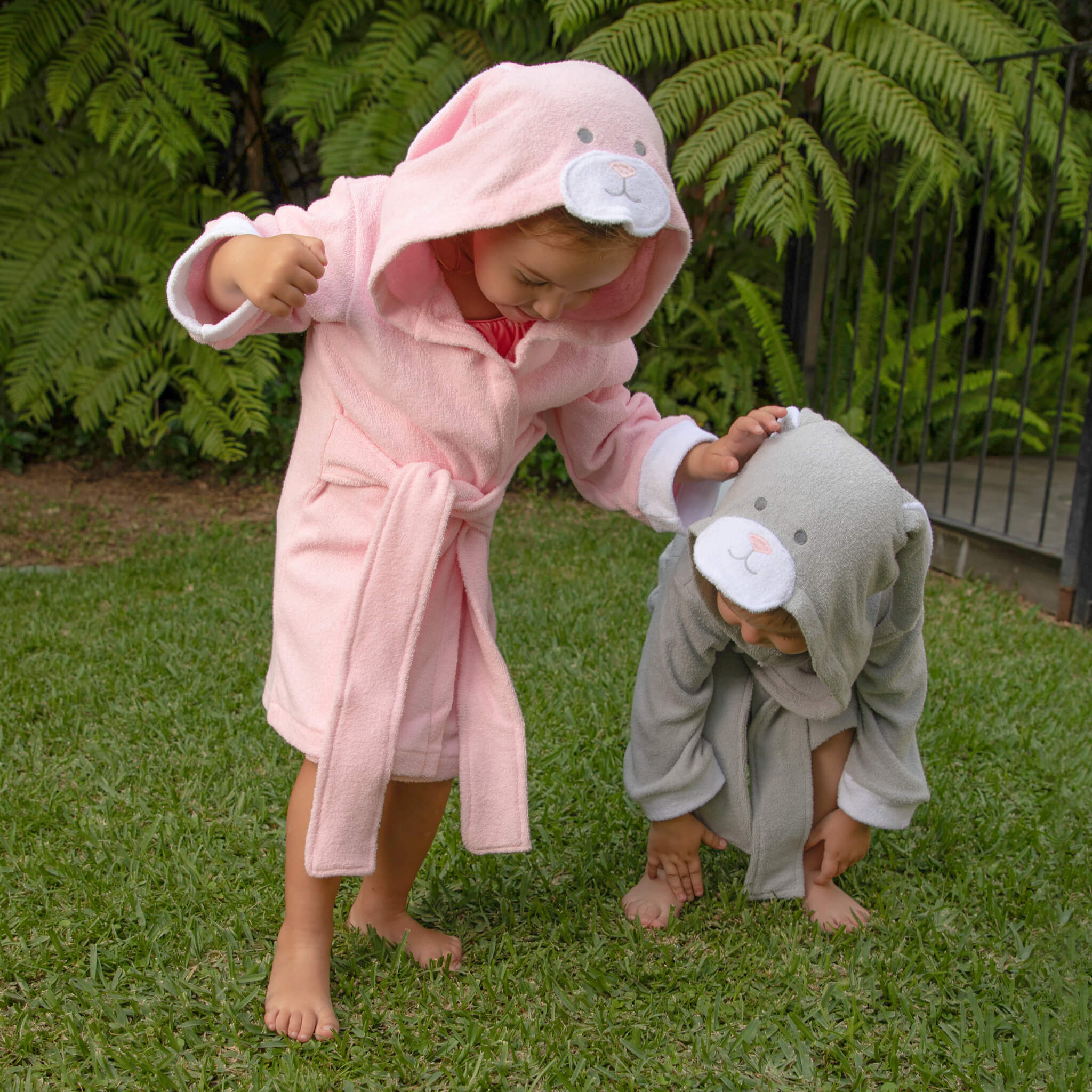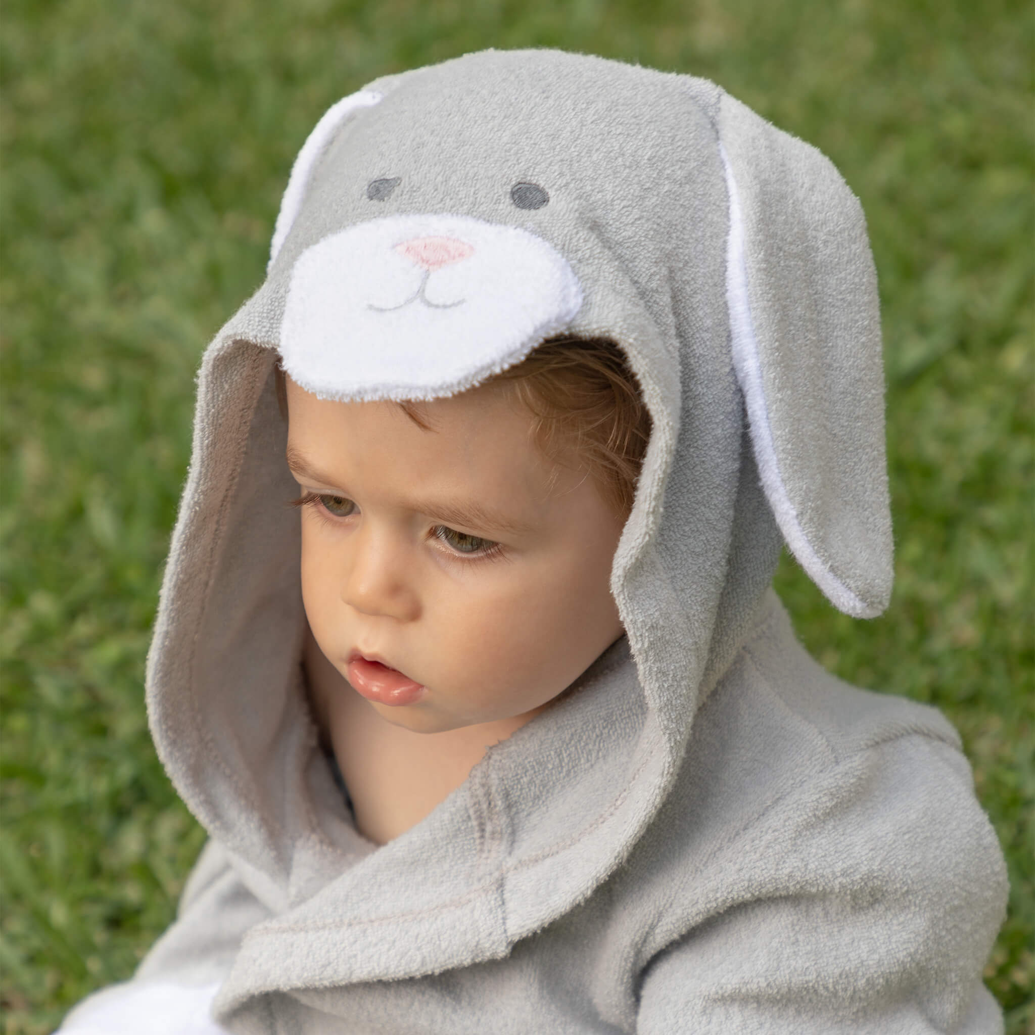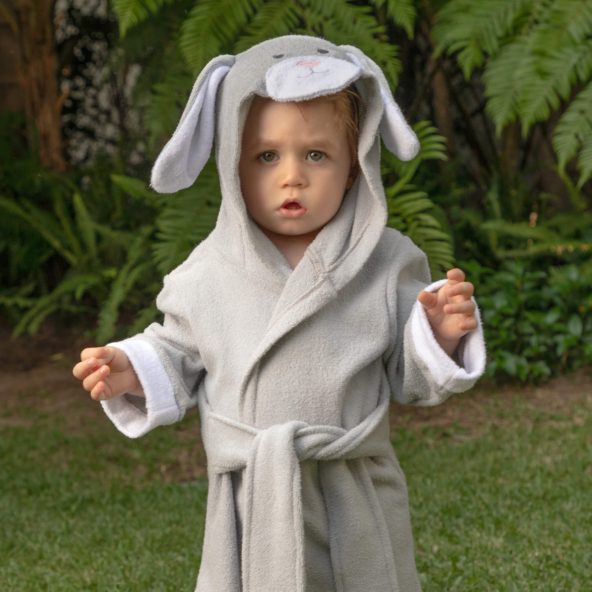 Ir la playa, alberca o tomar una ducha será más divertido ya que tu bebé se podrá secar con su animal favorito, con nuestro diseño de bata de baño para bebé Babuu Baby, hecha de toalla 100% algodón, con divertido diseño de conejo gris con orejas y ojos juguetones. La capucha protege los oídos del bebé o niño del aire, al sacarlos del agua.