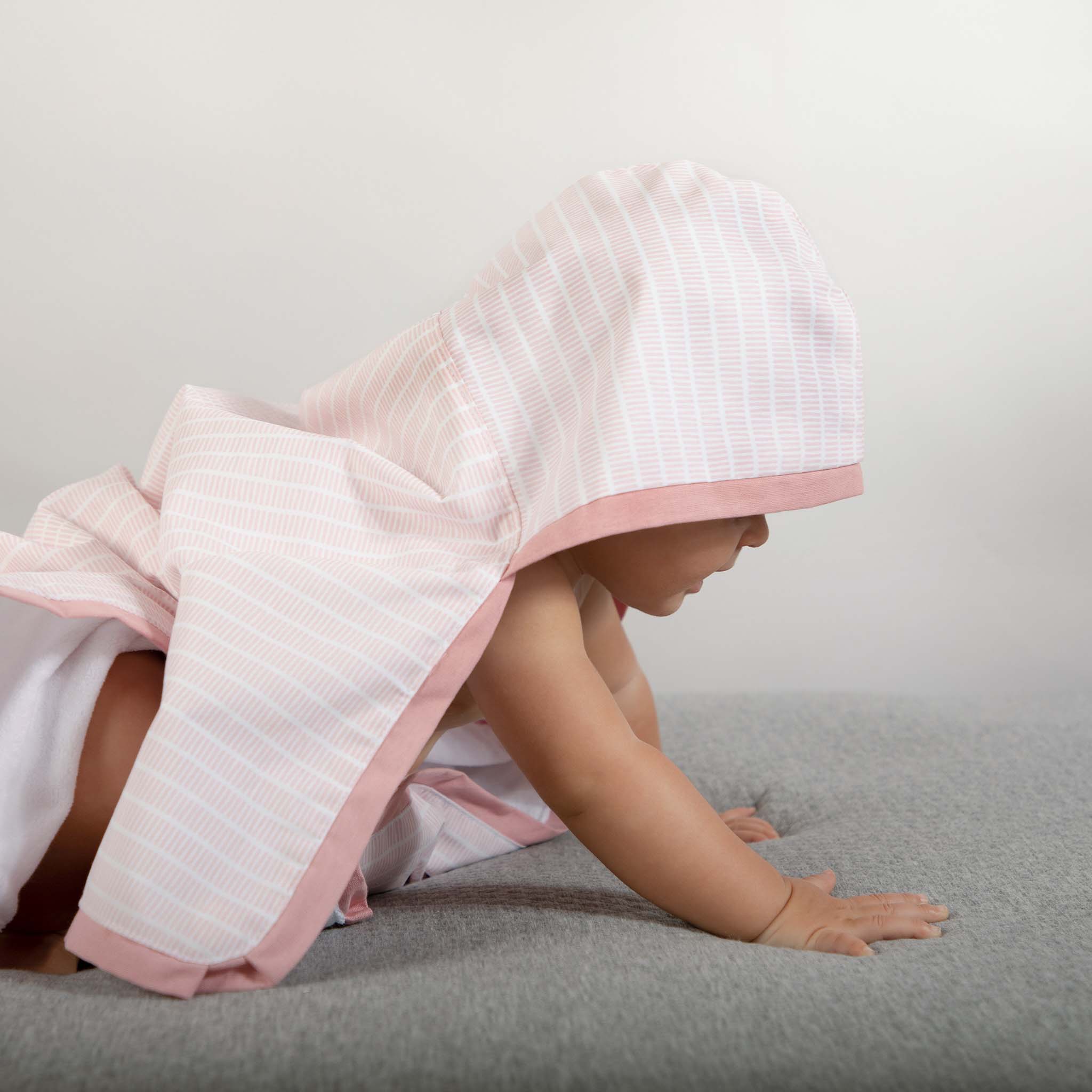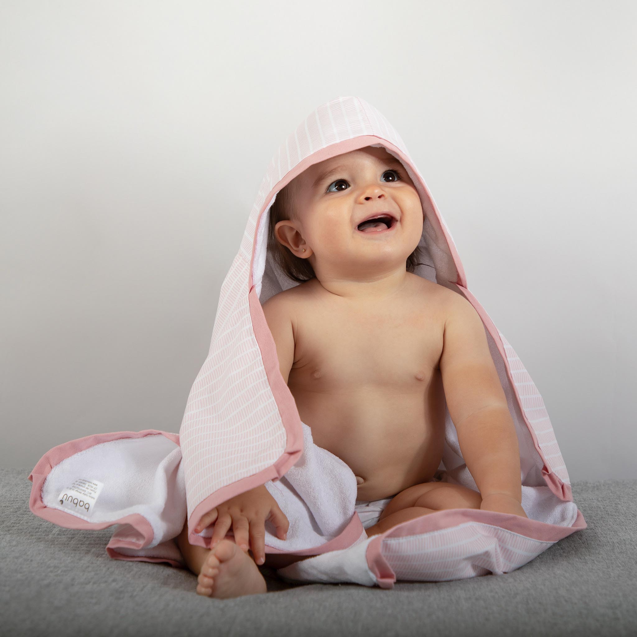 Nuestras capita Babuu Baby mantendrán a tu bebé calientito y seco, gracias a su doble capa, en el interior toalla suave blanca 100% algodón y exterior de tela impresa 100% algodón cuidando la piel de tu bebé. Tiene divertido diseño en tonos rosas y tiene un gorro amplio para proteger la cabeza de tu bebé de los cambios de temperatura.