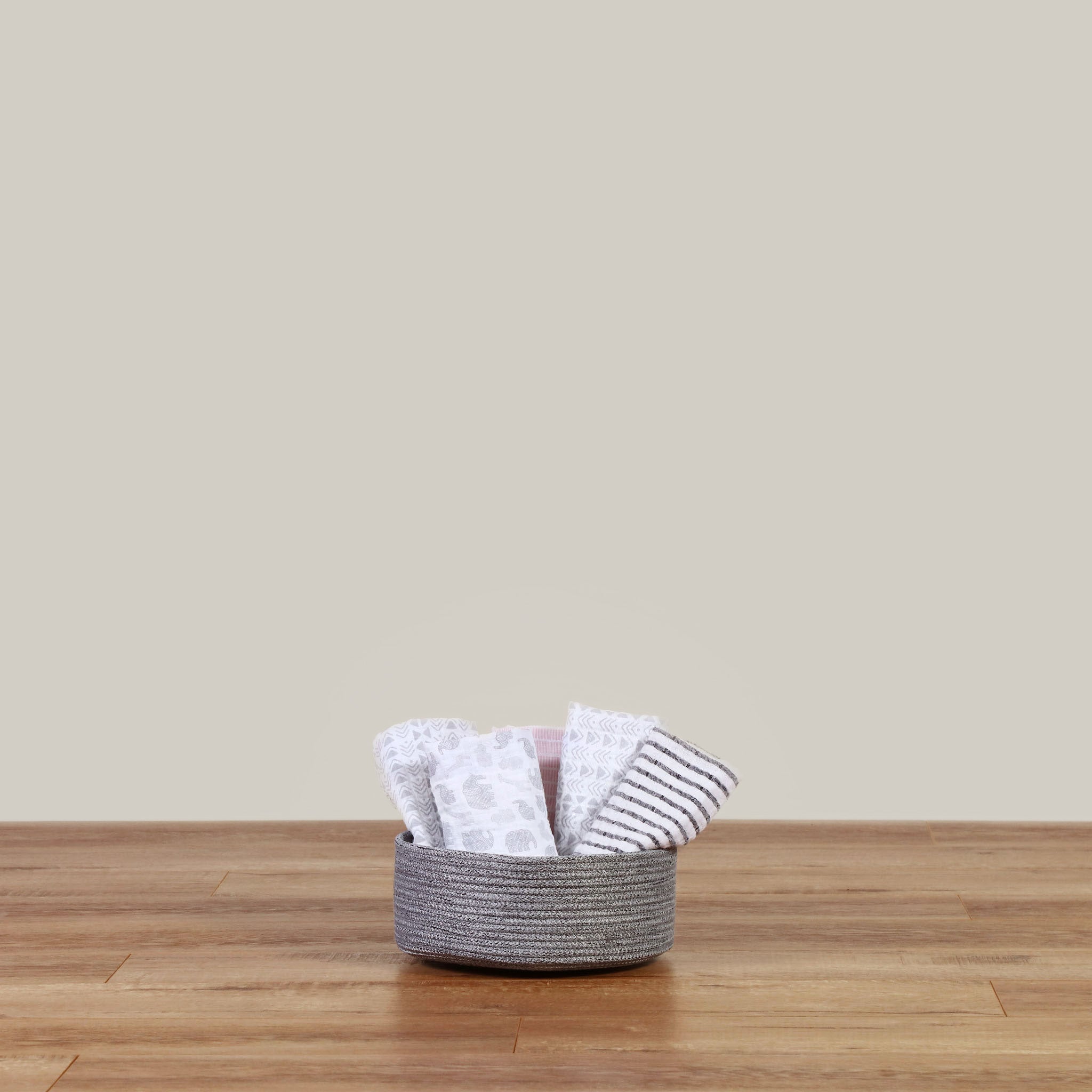 Es un cesto multiusos versátil, gris de algodón y fibras que combina con cualquier color y estilo de decoración, también se puede usar como maceta con plantas pequeñas, colocando la maceta dentro del cesto y para las llaves o correspondencia.
