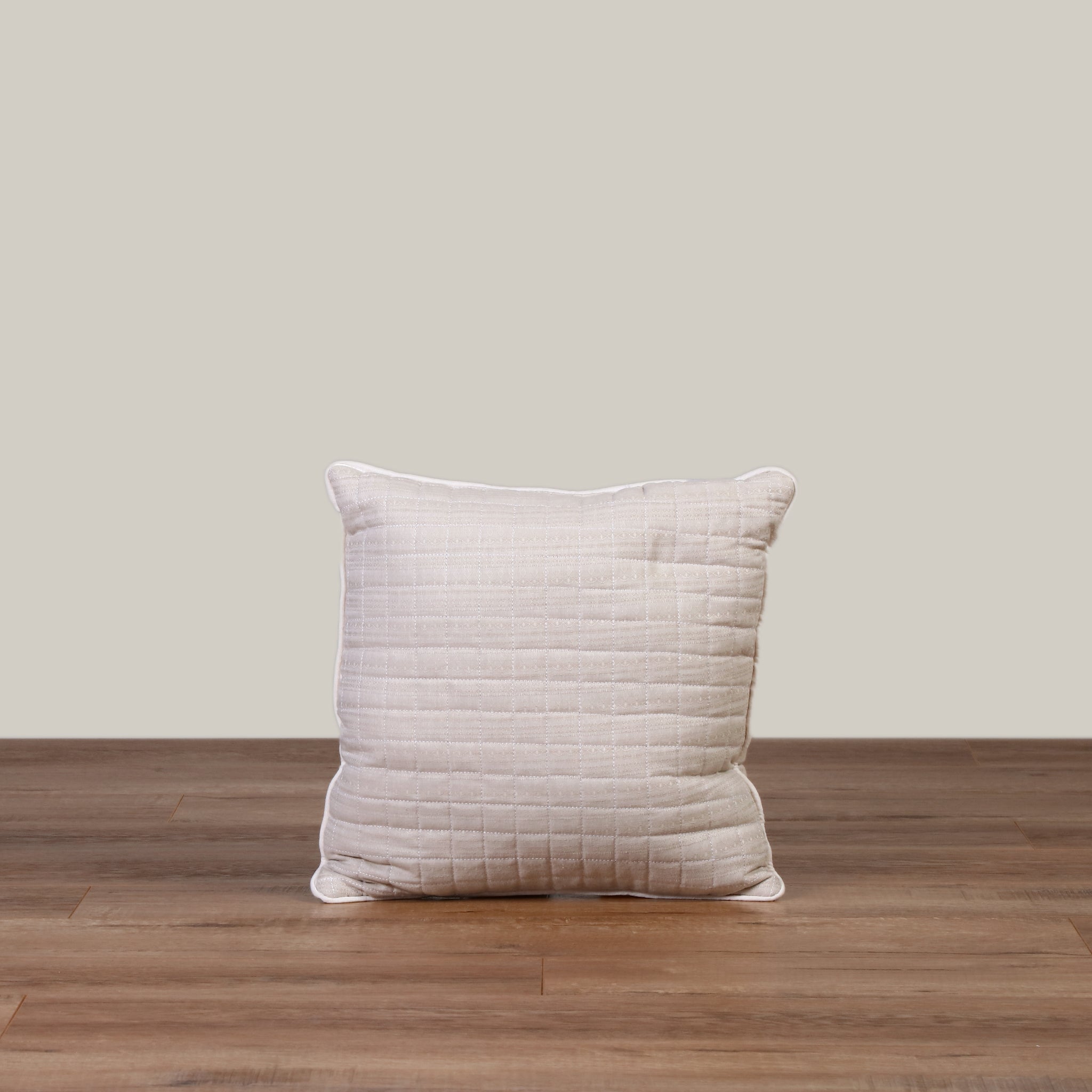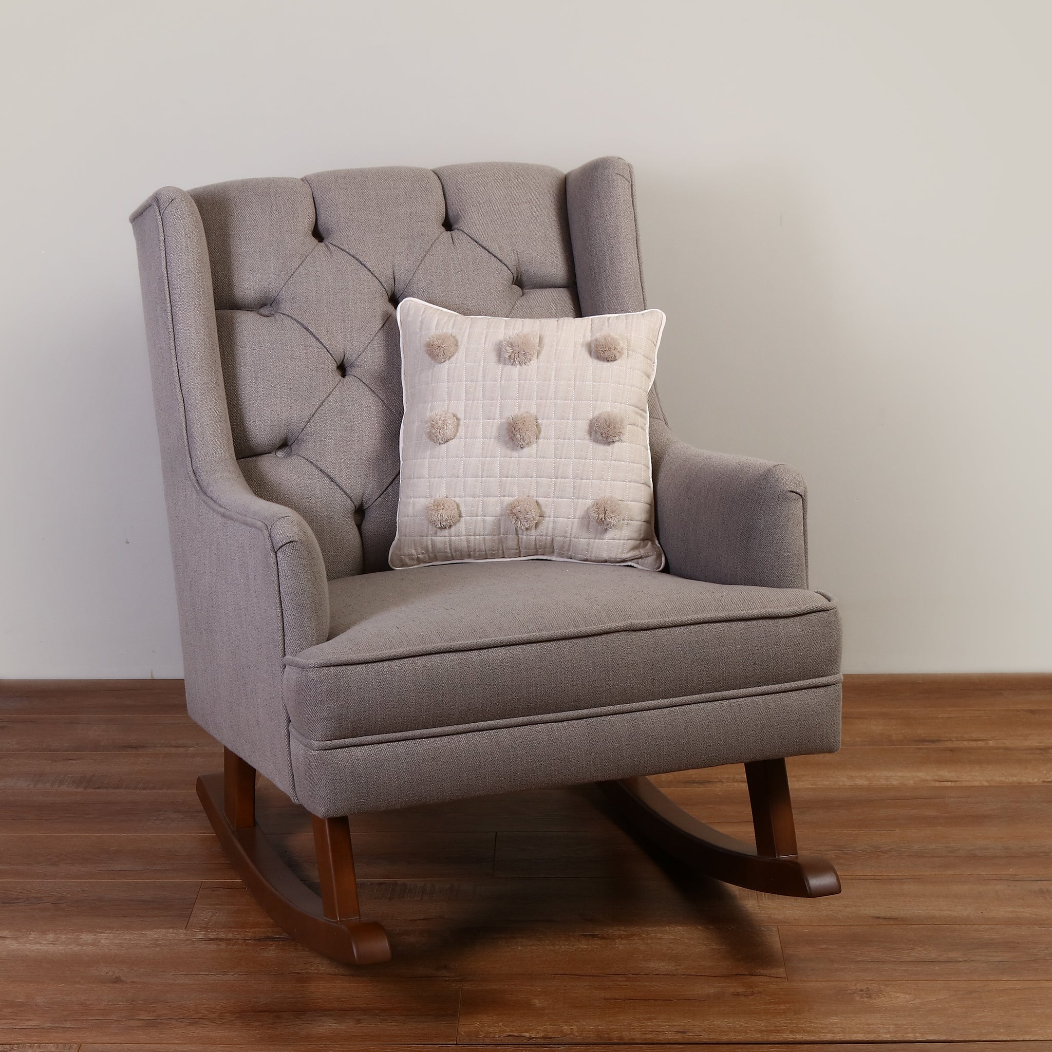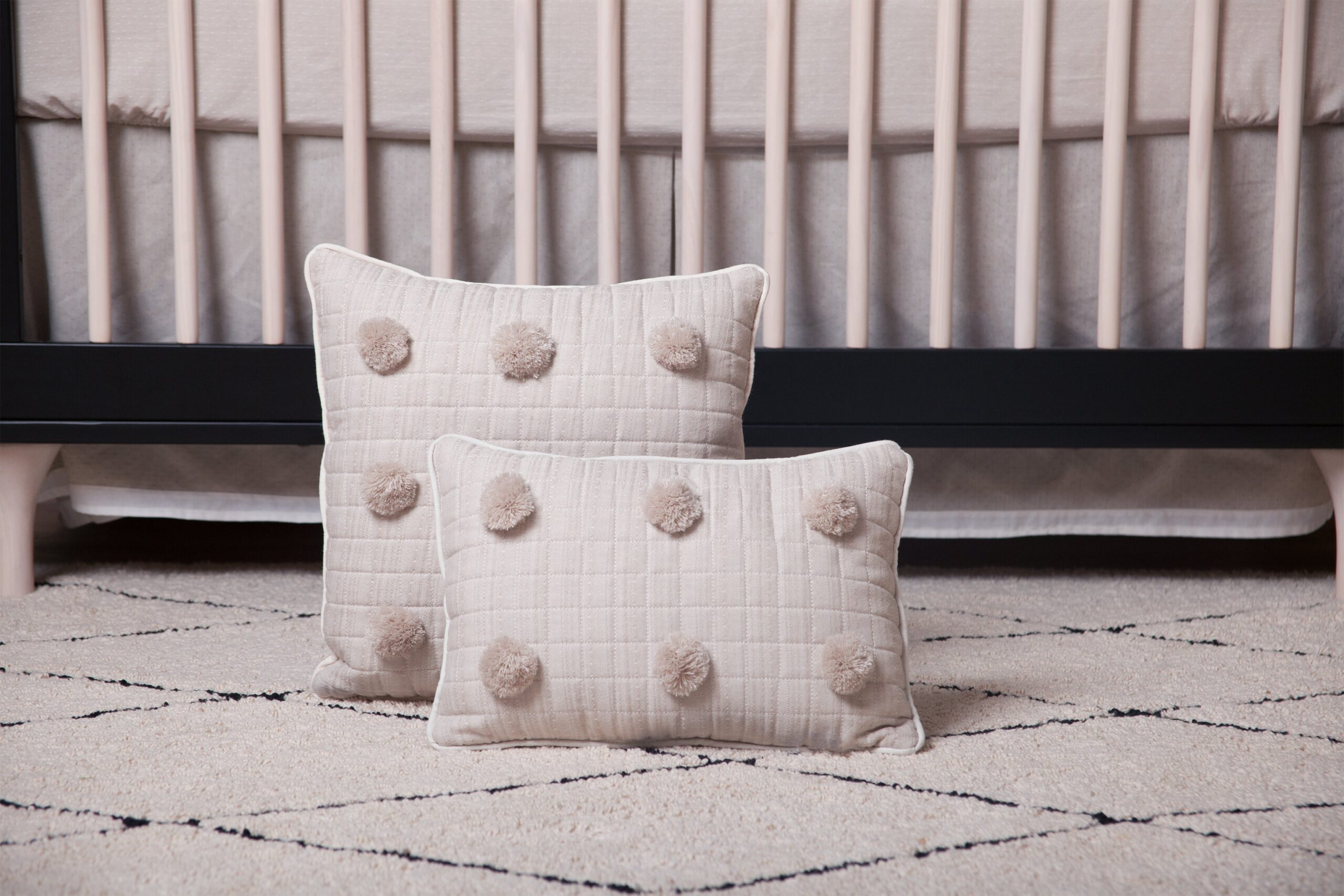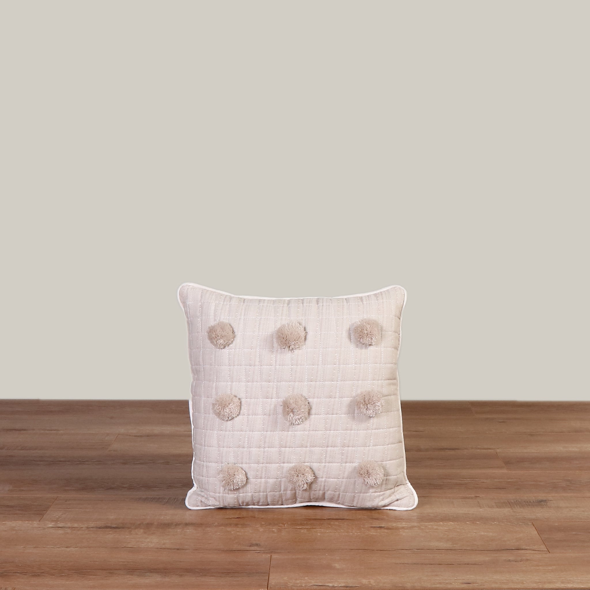Su diseño con beige capitonado decorativo, con detalle de pompones de estambre hipoalergénico beige claro. Detalle de ribete en rosa palo en toda la orilla del cojín, combina con cualquier color y harán que cualquier espacio luzca moderno y elegante.