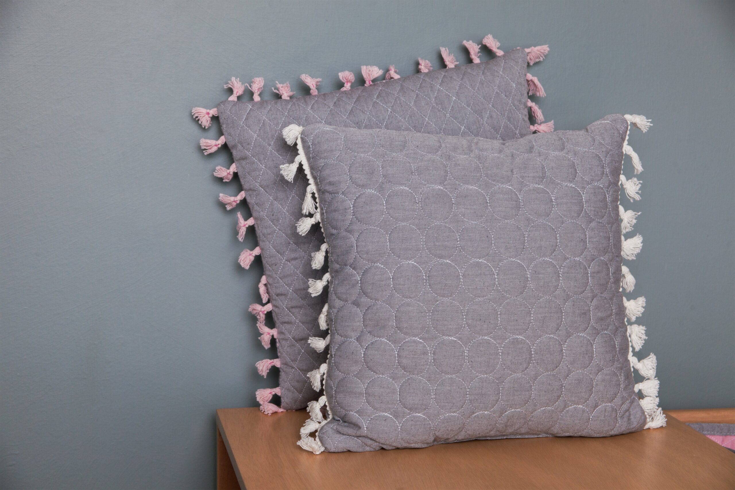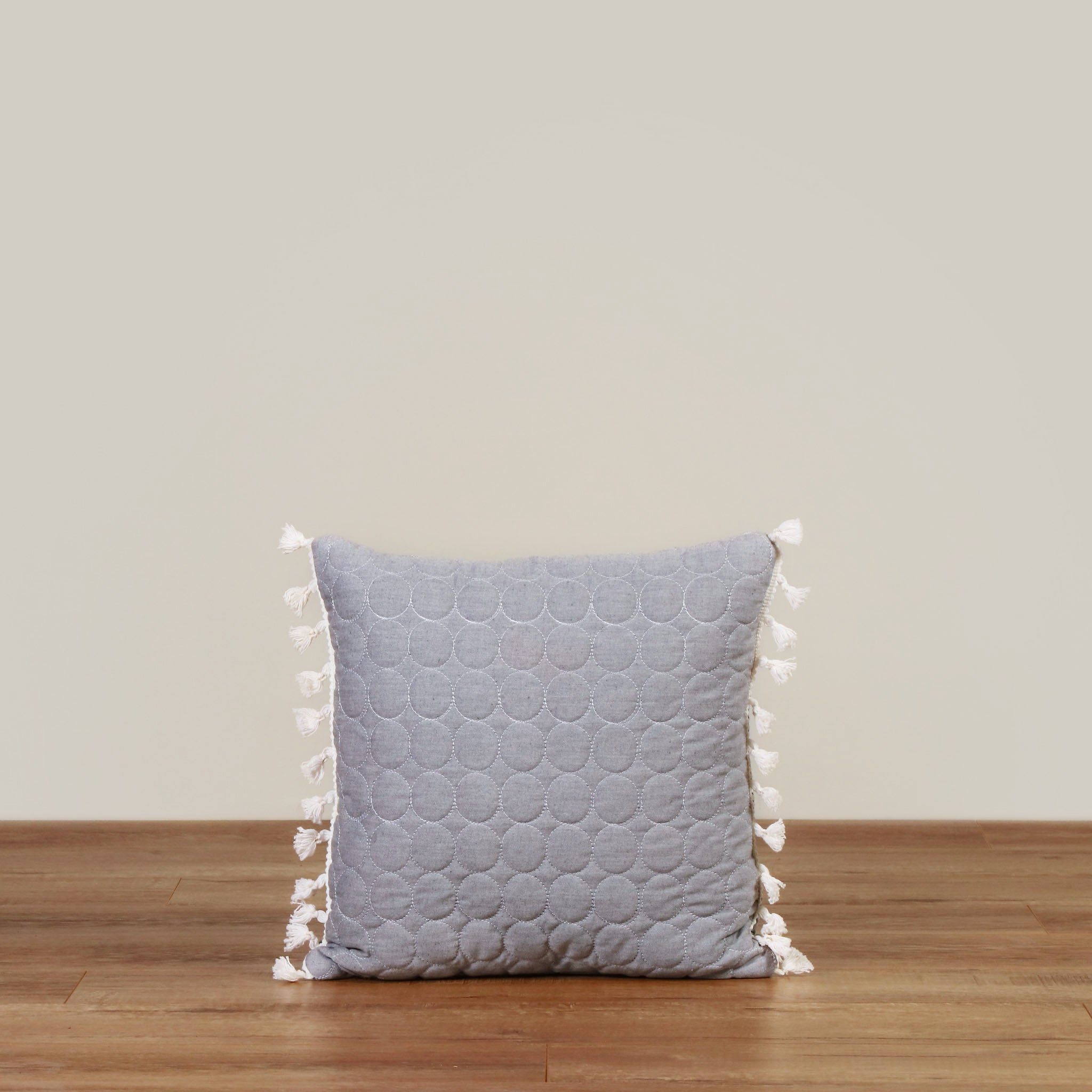 - Cojin gris obscuro decorativo capitonado en círculos, con detalle de barbitas de estambre hipoalergénico beige, en la orilla del cojín.