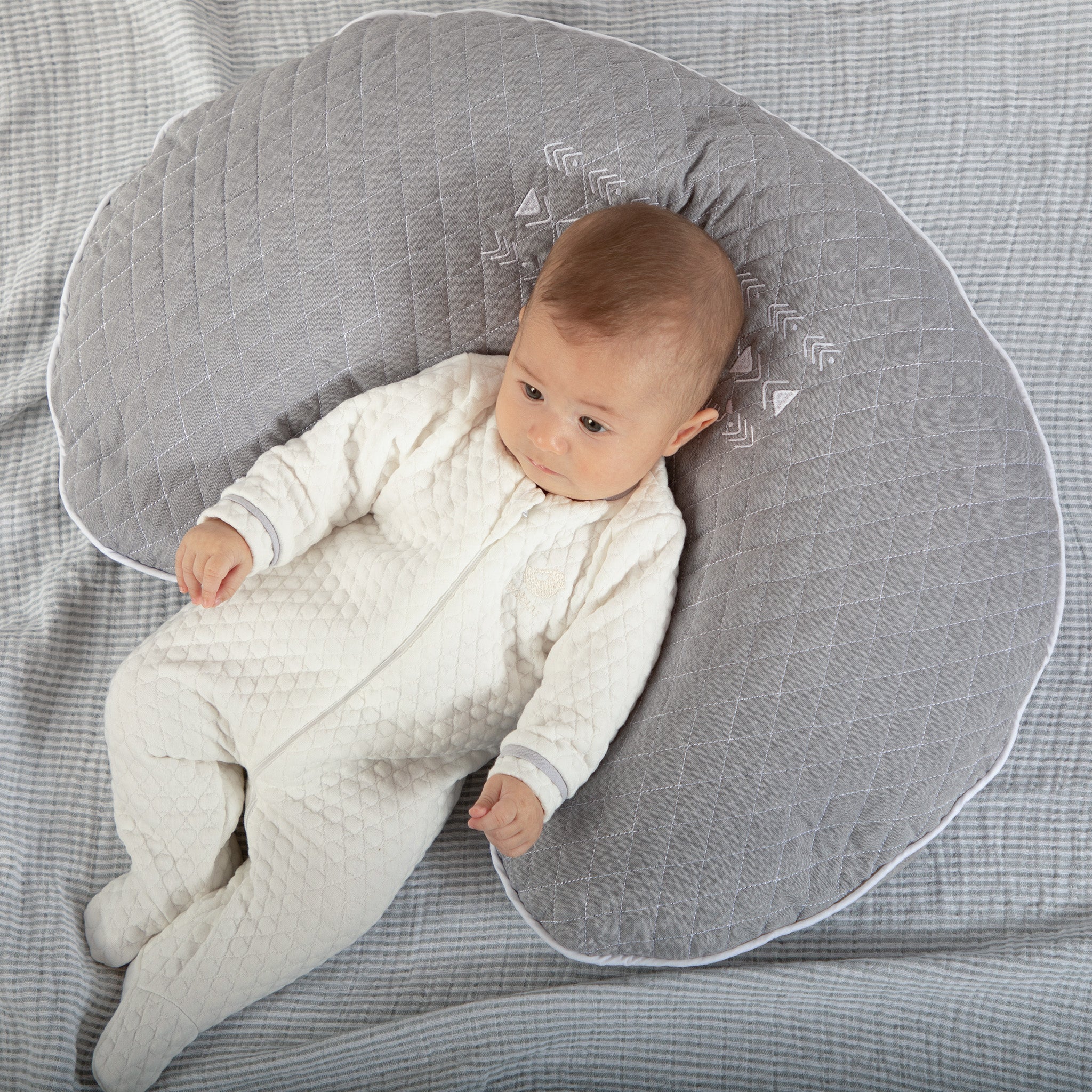 Te acompañamos en cada etapa a tu bebé y a ti, cojín de lactancia Babuu Baby es el accesorio ideal que te ayuda en el embarazo, lactancia, descanso del bebé recién nacido y de apoyo cuando crece, con diseños de grecas bordados en color gris sobre tela gris capitonada y un material 100% algodón