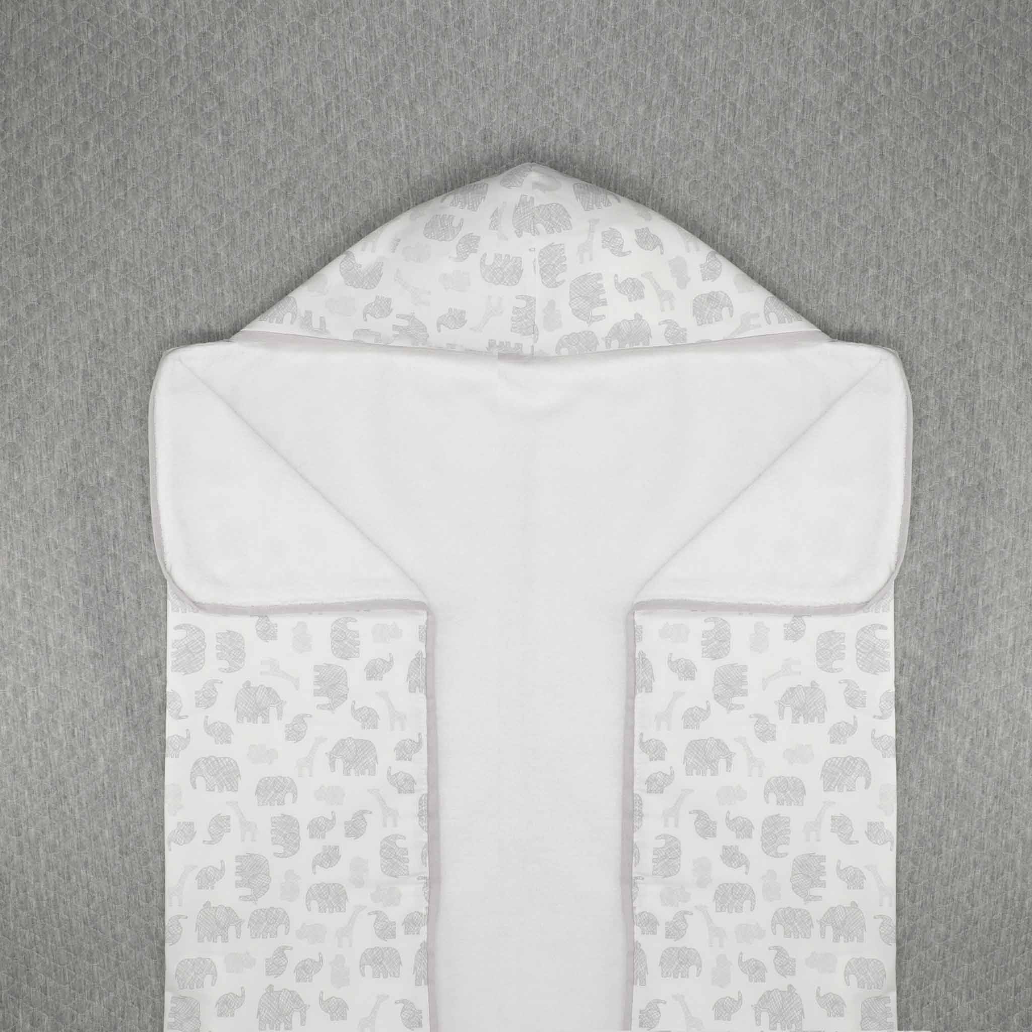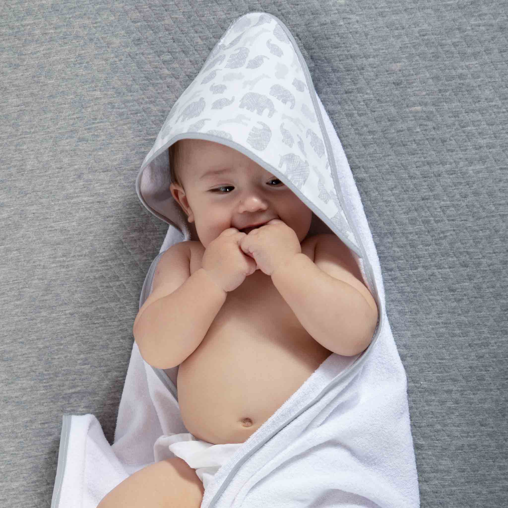 Cuida y dale estilo a tu bebé al salir de la ducha con nuestras toallas para bebé 100% algodón con diseño de tiernos elefantes en tonos grises. La capucha protege del aire los oídos del bebé, al sacarlos del agua.
